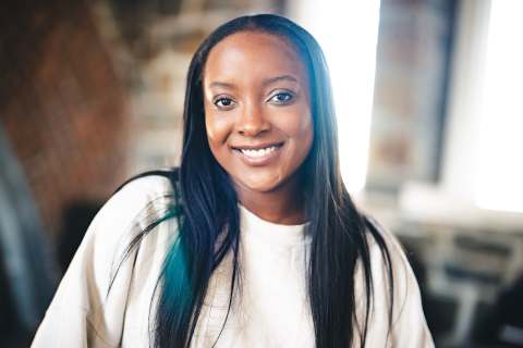 Terry-Ann Jones poses for a photo sitting on a bench. She wears a blue dress and smiles at the camera.
